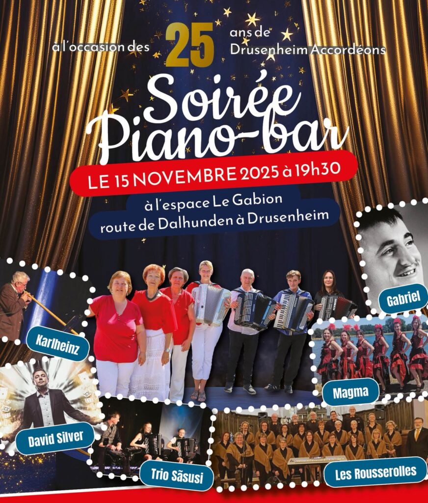 Le samedi 15 novembre, l’association Drusenheim Accordéons soufflera ses 25 bougies au Gabion, avec la participation de différents artistes. Aux accordéonistes s’ajouteront la chorale « Les Rousserolles » de Dalhunden, le groupe de danses « Magma » d’Oberhoffen-sur-Moder, le trio Sasusi, le chanteur Gabriel, le soliste à l’Alphorn Karlheinz Eisen et le magicien-mentaliste David Silver. […]